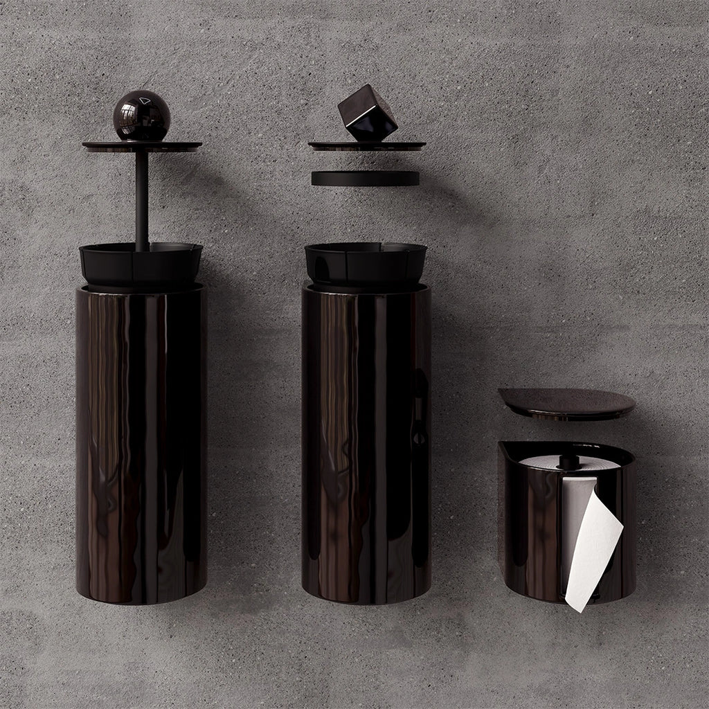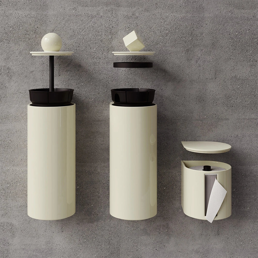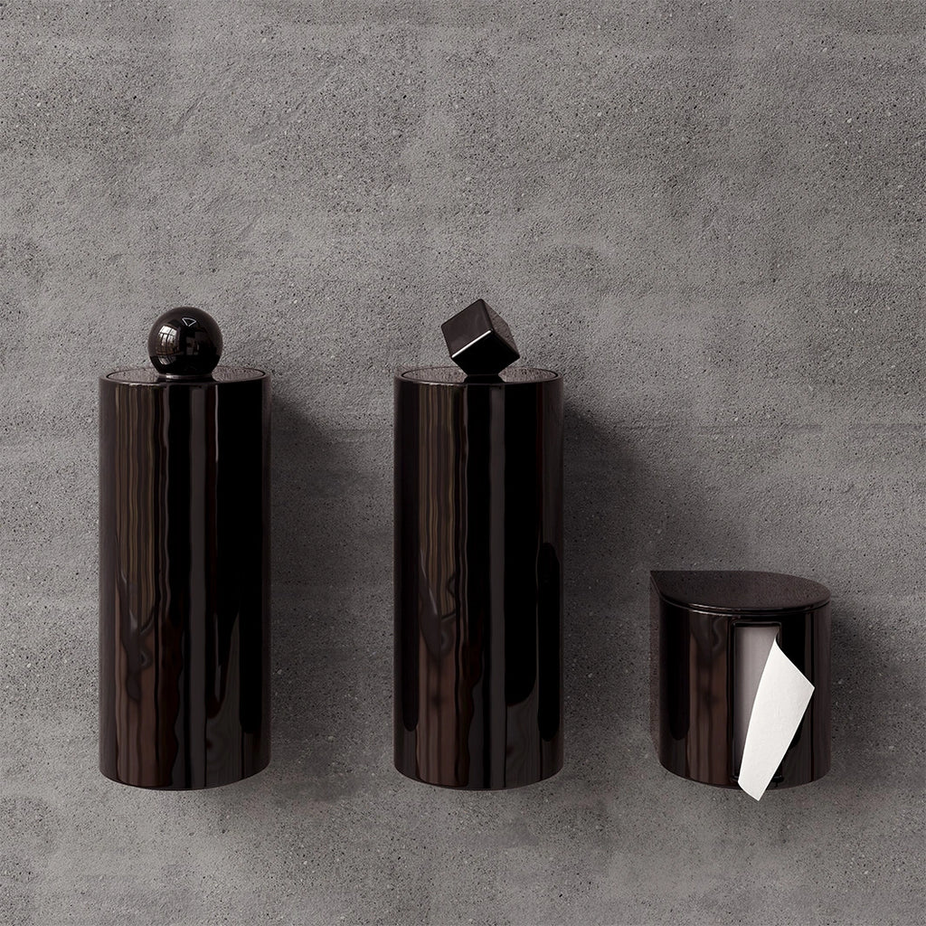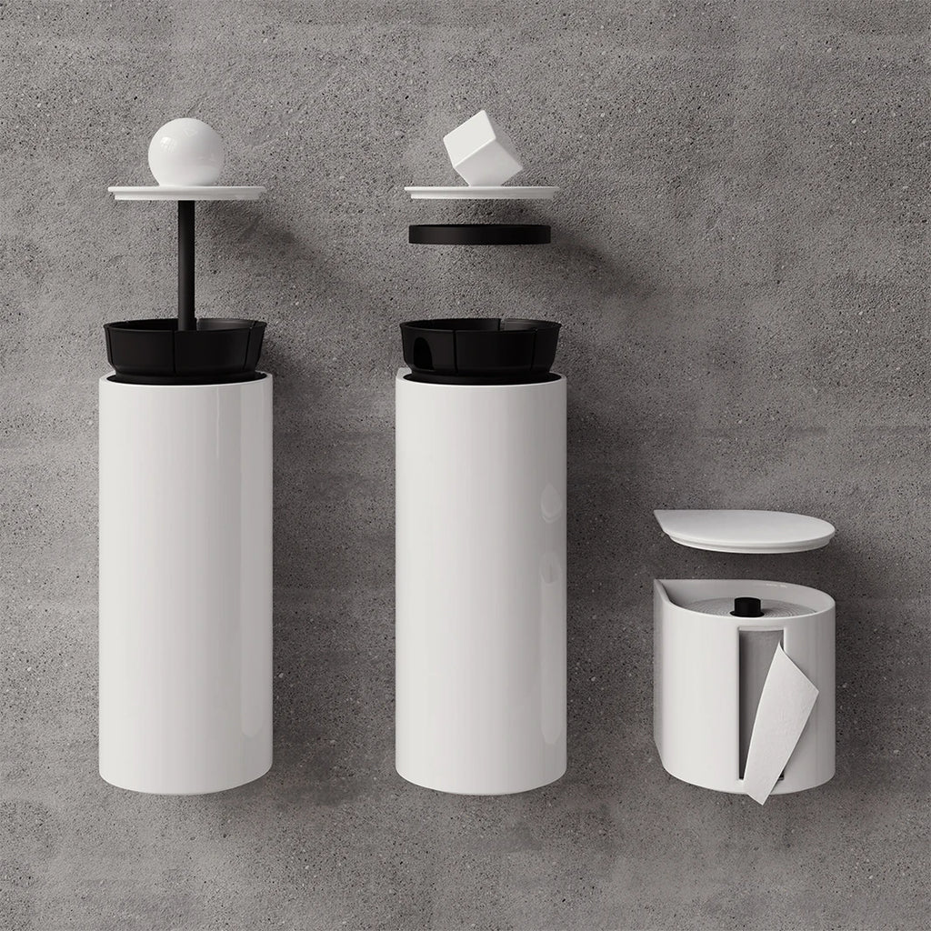 Avec la collection Trium, les accessoires de toilettes s’affirment pleinement. Dérouleur, brosse et poubelle : un trio pensé pour allier design, hygiène et efficacité. Inspirées des lignes géométriques emblématiques de Trone, ces pièces complètent l’espace avec audace et harmonie.